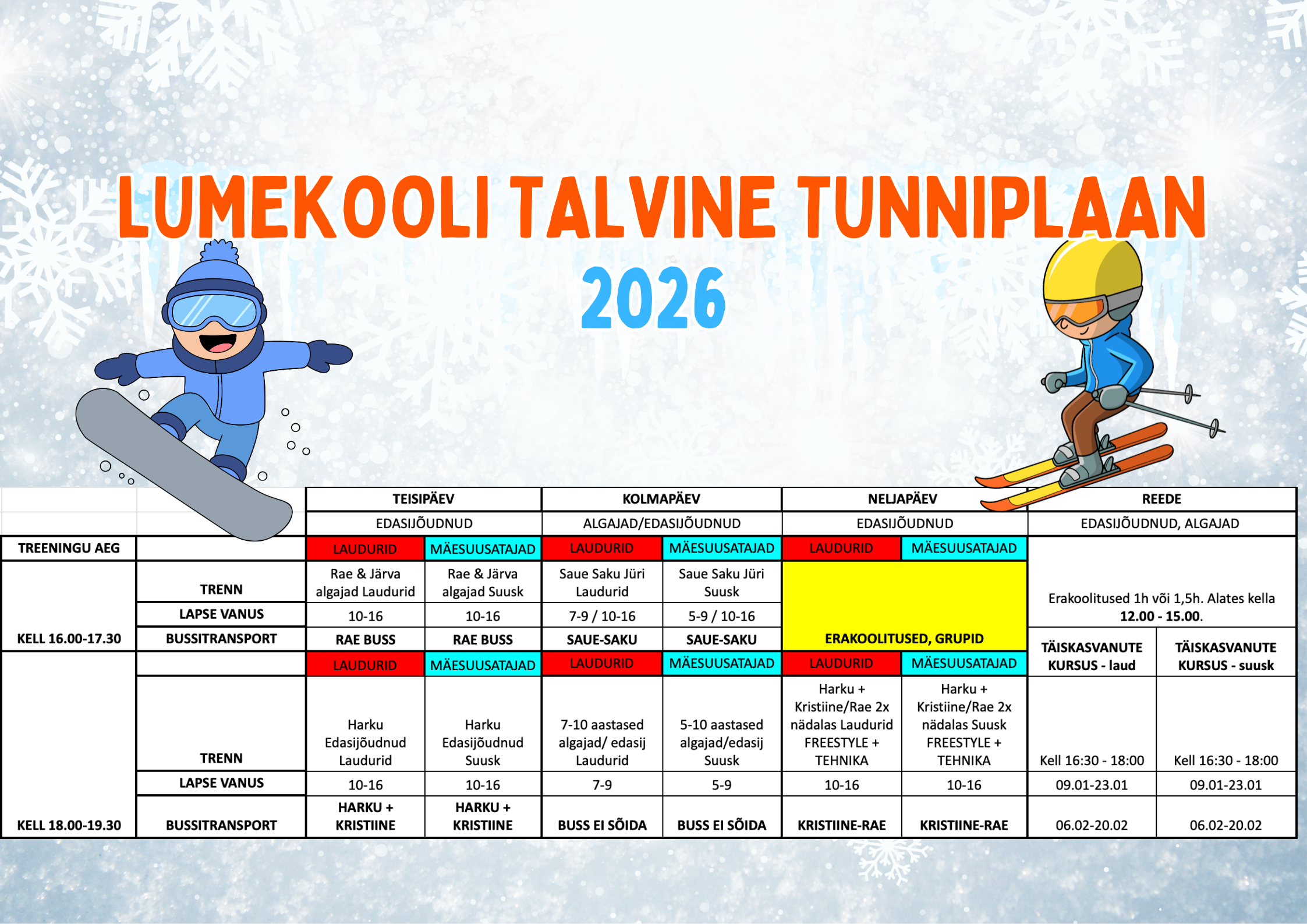 Lumekooli 2026. aasta talve trennid Valgehobusemäel. Treeningperiood: 5. jaanuarist kuni 26. märtsini (kokku 11 nädalat).Kuid kui lumi sulab varem, lõpevad treeningud vastavalt sellele. Kes saavad osaleda: 5–16-aastased lapsed....